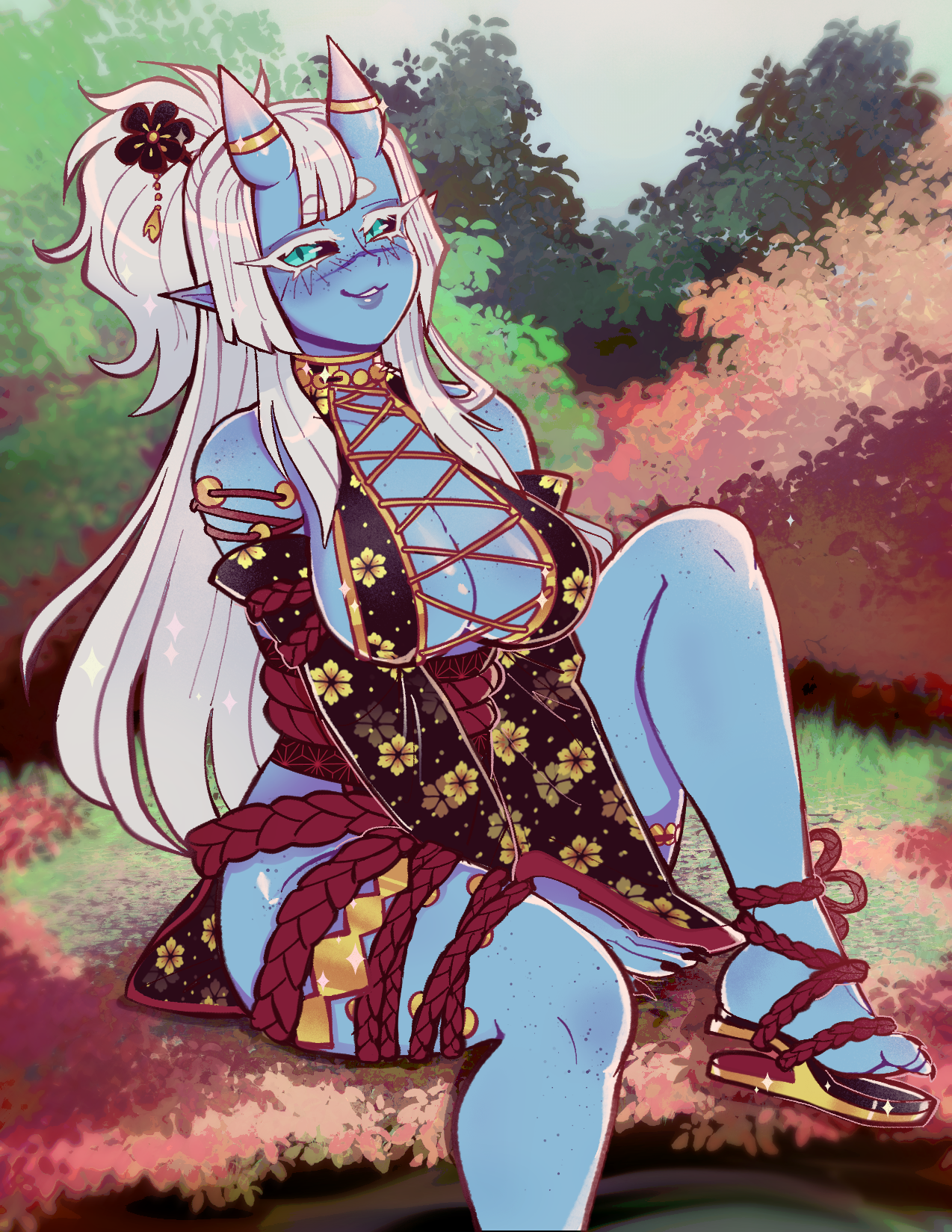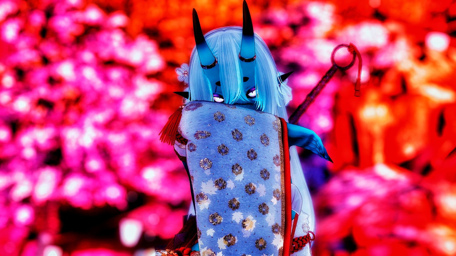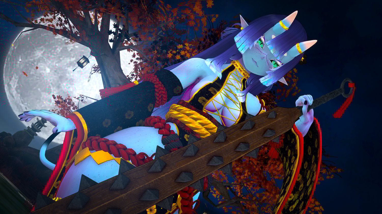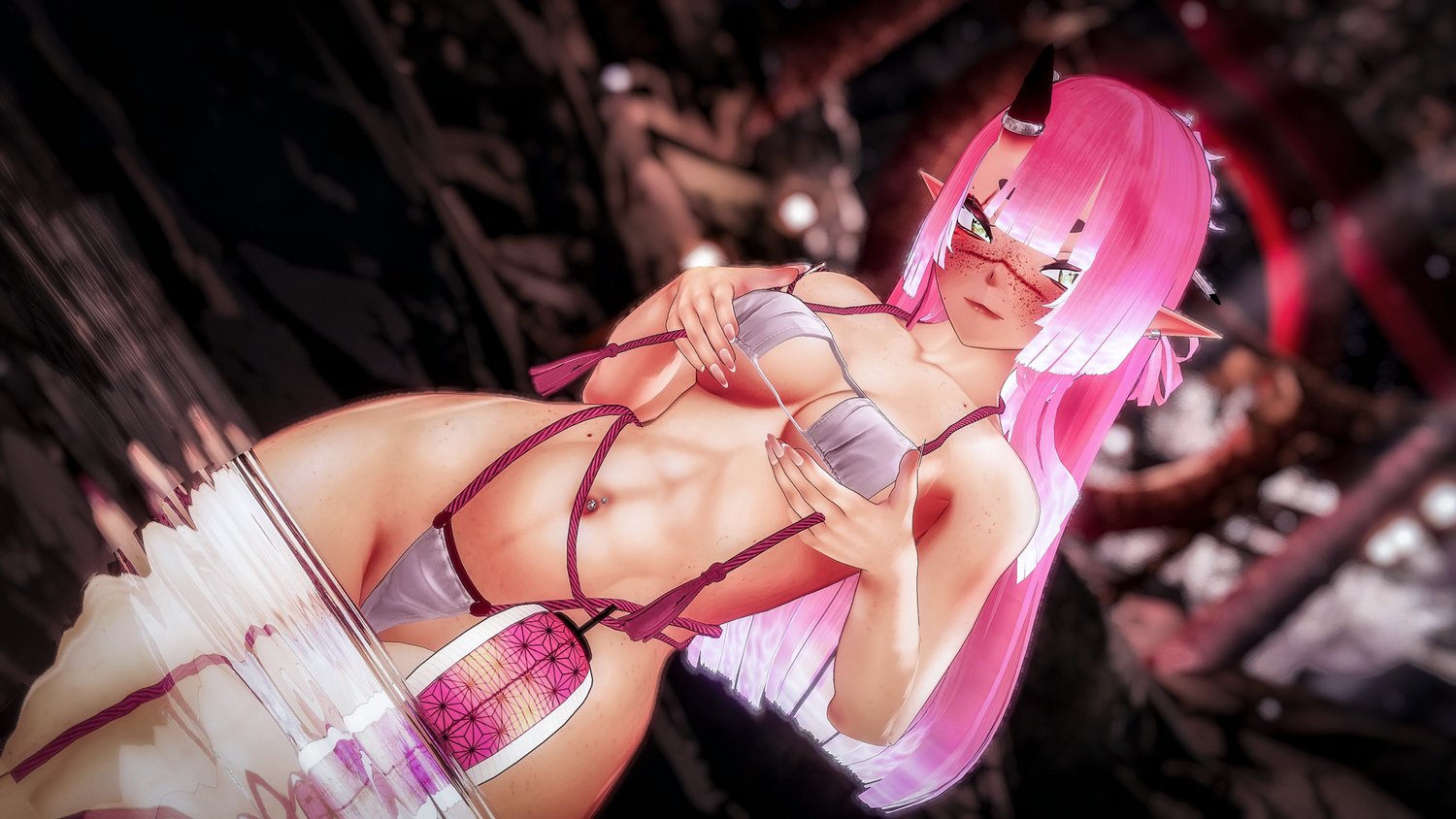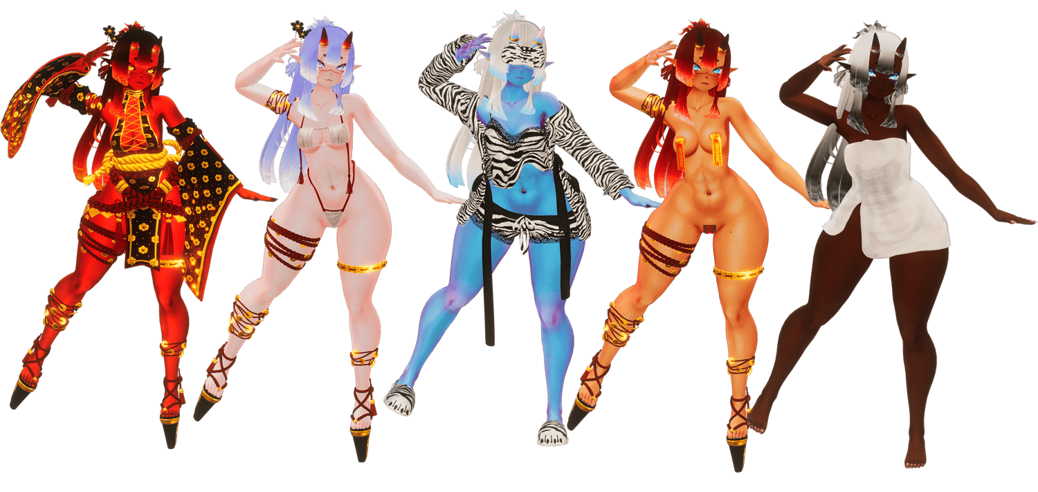 Pajamas acc (Mask and slippers), shoes, horns and tail, talisman, bed, lanterns, kanabo, bow and arrows, hairpins, dango, p*ssy + uterus and p*nis, piercings made from scratch by Melting3D.