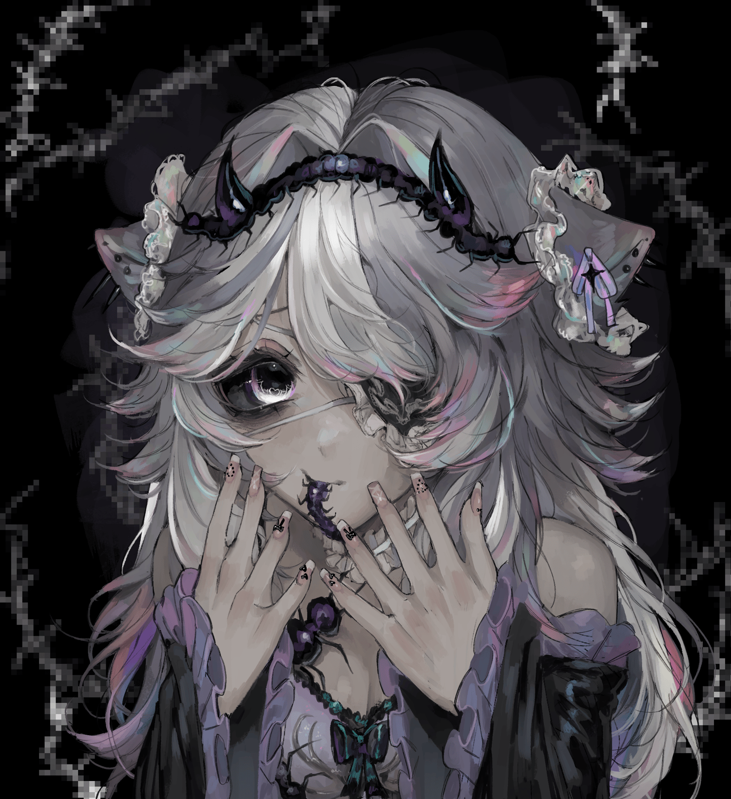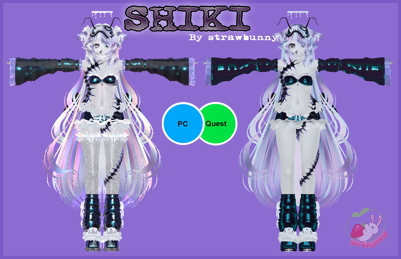 Unity work by Gonsodany, Blender work by Taylor, Quest conversion by Noelia ✩ Head and body ✩ Hair front 1 - 2 ✩ Hair back 2 ✩ Nails ✩ Sleeves ✩ Dress ✩ VOID ✩ Eye Tex ✩ Centipede Clothing ✩ Centipede Head and Mouth - Tail - Antenna - Follower ✩ Halo ✩